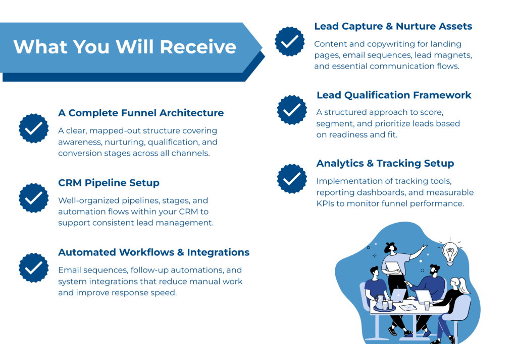 Our goal is not only to help you attract more leads but to build a repeatable, data-driven acquisition system that supports your long-term scalability. We design funnels that integrate awareness, engagement, nurturing, qualification, and conversion, ensuring that your pipeline is predictable and your team is empowered with the right structure.