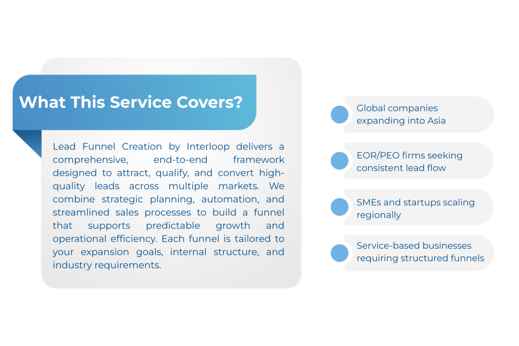 Interloop combines deep regional expertise with a data-driven approach to help businesses build scalable, predictable growth systems. Our Lead Funnel Creation service is engineered to align your marketing, sales, and operational processes into a seamless workflow that supports long-term expansion across multiple markets.